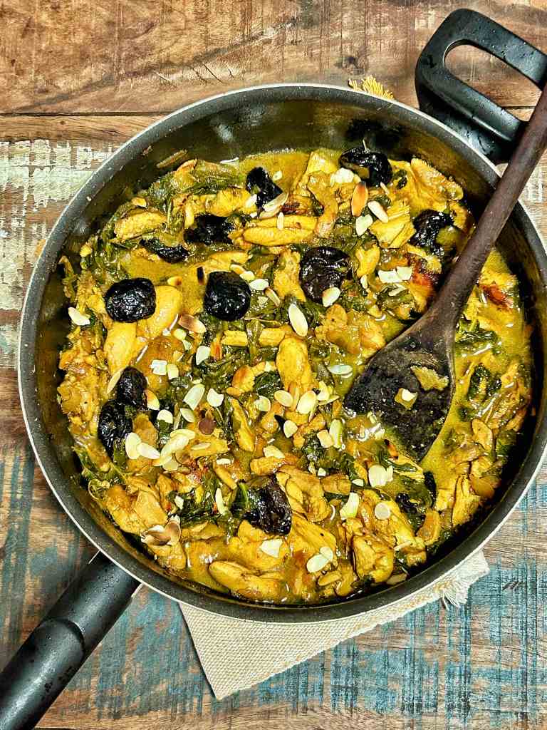 Uno dei libri da cui più cucino ultimamente è “The Saffron Tales” di Yasmin Khan @yasminkhanstories, della quale è uscito da poco un altro libro “Sabzi”. Ve ne parlerò appena possibile. La ricetta che vi propongo oggi è meravigliosa. Si tratta di un’altra deliziosa ricetta della tradizione culinaria iraniana. È uno stufato di pollo con spinaci e prugne secche, che tipicamente si prepara con il succo delle arance rosse, che conferiscono al pollo un sottile sentore agrodolce ed esaltano le note terrose degli spinaci. Ma se non le trovate facilmente, e magari adesso non è periodo, potete sostituirle con delle arance comuni (qui si possono reperire tutto l’anno!) combinate con il succo di un bel lime verdastro, per fornire al piatto un sapore intenso e piccante. Servite il pollo con riso e insalata verde.