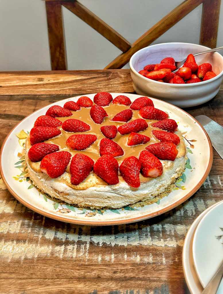 Al momento di servire, capovolgete la teglia su un piatto da portata, quindi rimuovete l’anello della teglia a cerniera e sollevate il fondo. Rimuovere con cura la pellicola trasparente e spalmare il dulce de leche sulla superficie della torta, lasciando scoperto il bordo esterno dei biscotti. Guarnire la torta con fragole e fiori commestibili, se lo si desidera, e servire.