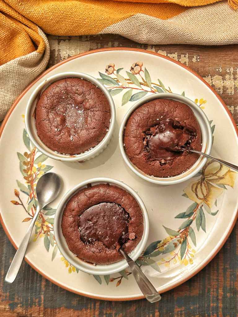 Questo dessert ricco e goloso si ispira alle infinite tazze di caffè nero aromatico e profumato al cardamomo che i palestinesi bevono tutto il giorno. È un abbinamento gastronomico maestoso, con le note calde e speziate del cardamomo macinato che si sposano perfettamente con il caffè amaro. Yasmin Khan ha quindi pensato di aggiungere del cioccolato. È possibile preparare l’impasto in anticipo e semplicemente mettere le tazze in forno poco prima di servire. Sono necessari 6 ramequins, dal diametro di 8 cm, oppure solo 4 ramequins da 12 cm.