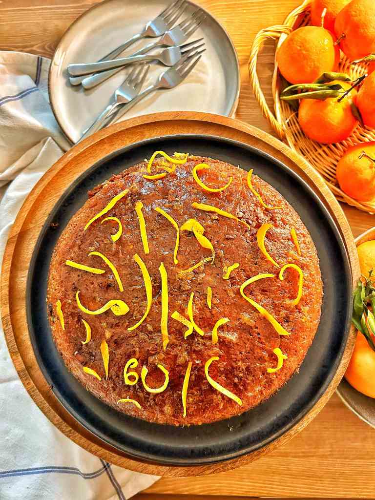 Non appena la torta esce dal forno, spennellarla con lo sciroppo bollente, assicurandosi che lo sciroppo venga assorbito completamente. Lasciar raffreddare completamente la torta nella teglia prima di rimuoverla. Può quindi essere servita così com’è, guarnita con strisce di scorza d’arancia, oppure conservarla per un massimo di 3 giorni in un contenitore ermetico.