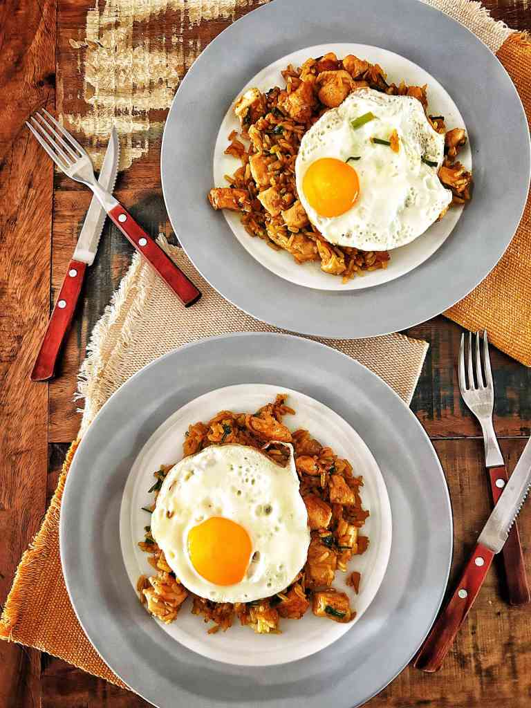 Il Nasi Goreng è un piatto semplice, efficace, buonissimo, molto popolare in tutta l’Indonesia. Praticamente la parola “nasi goreng” vuol dire nient’altro che “riso fritto”. Poi lo si abbellisce con pollo, gamberi e qualsiasi altra invenzione creativa culinaria, anche con quei resti in frigorifero che diventano sublimati in questa ricetta. In questa versione del nasi goreng lo zenzero e il pepe bianco gli conferiscono una piacevole piccantezza, bilanciata dalla dolcezza del “kecap manis”, una salsa meravigliosa indonesiana, che si può fare perfettamente in casa con ottimi risultato. L’aggiunta dell’uovo è necessaria e tutto questo fa di questo piatto un lunch perfetto, rapido e confortante per ogni giorno della settimana.
