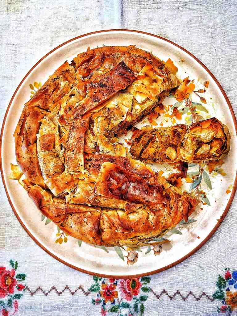 Premessa: io non ho il dono della manualità. Chi è dei miei tempi si ricorderà della quasi – per me – tragica materia di educazione tecnica. La odiavo. La materia più orribile e triste di quel periodo un po’ scuro che si chiama “scuola media”. L’educazione tecnica aveva lo scopo di introdurmi ai metodi tecnici e alla cultura tecnologica, sviluppando competenze digitali e abilità pratiche. Insuccesso totale. Le attività includevano, un tempo, il disegno tecnico, lo studio di materiali e molto molto molto stress. Oggi si è aggiunto (per fortuna sono diventato professore di altro) lo studio delle fonti di energia, l’informatica, la consapevolezza ambientale e la sicurezza, e l’uso di strumenti digitali. Tutto questo per dirvi che questa torta salata greca alla zucca con la presenza di uvetta e harissa piccante doveva essere più bella, esteticamente gradevole. Pazienza. È colpa mia. Poteva andare meglio da questo punto di vista. Sulla bontà invece non si discute. Buonissima, perfetta, molto gustosa.