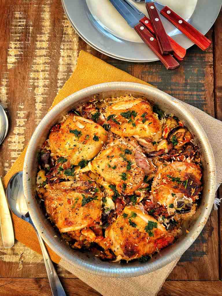 Una ricetta meravigliosa, tratta da “Simple”, della bravissima Diana Henry, un piatto utile, facile da preparare, in cui basta mettere tutto insieme, senza nemmeno bisogno di rosolare il pollo (anche se è bene cospargere la pelle con fiocchi di sale marino, per renderla più croccante). Si tratta di un pollo speziato, ispirato alla cucina marocchina, con datteri e melanzane.