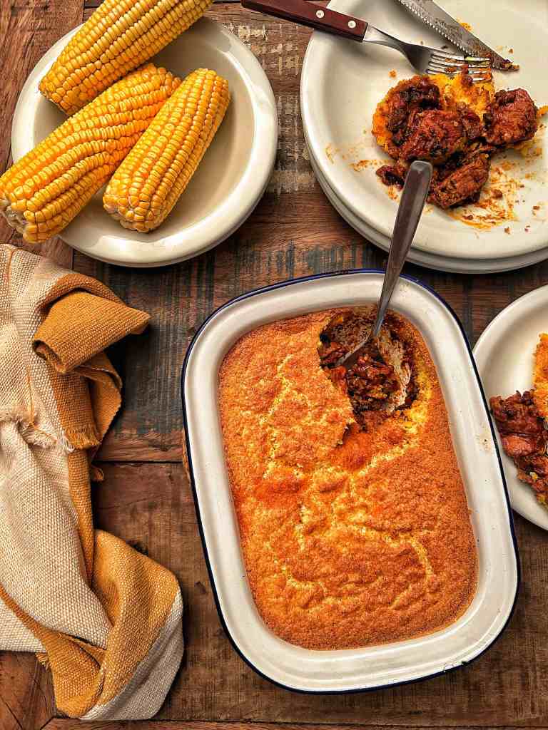 Questo piatto, tratto dall’ormai classico “Simple”, di Yotam Ottolenghi, è perfetto per una giornata autunnale, come il Giorno del Ringraziamento, e potrebbe andare servito con un’insalata verde croccante. Il pollo cotto lentamente è ricco di sapore e la crosta croccante, senza glutine, ricca e dal gusto di mais, rappresenta un cambiamento gradito (e più leggero) rispetto al purè più pesante.
