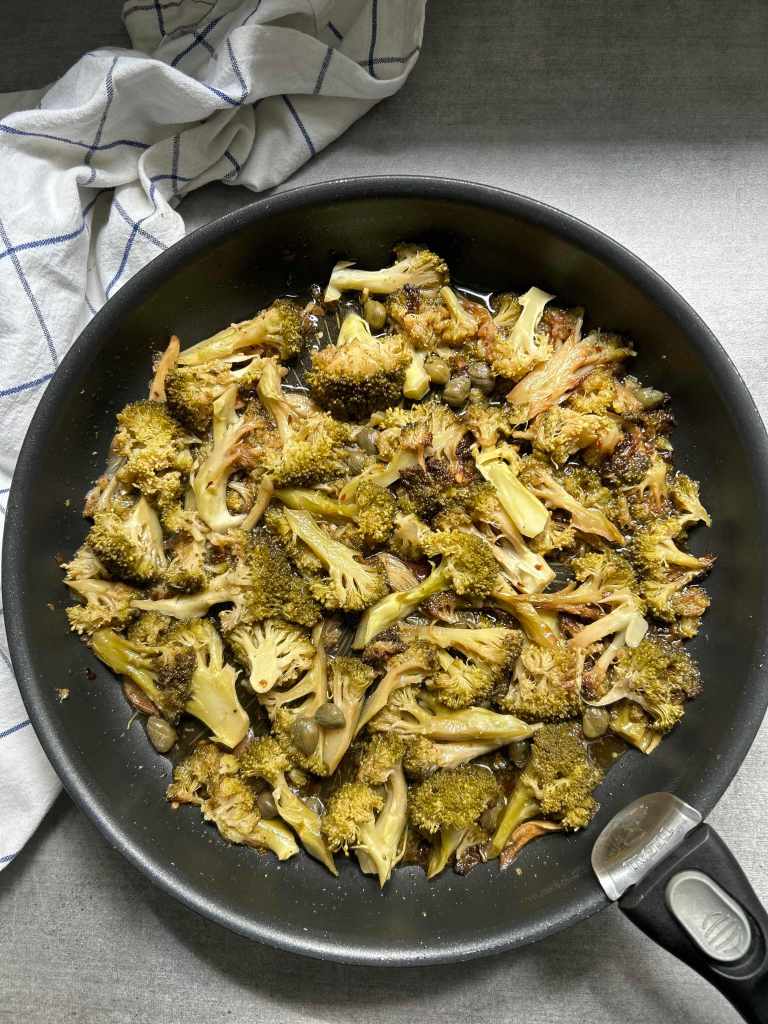 Mettere una pentola capiente o una casseruola a fuoco medio. Aggiungere i broccoli, l’olio d’oliva, l’aglio, i capperi, il peperoncino rosso in fiocchi e il sale marino, condire con qualche macinata di pepe nero e scaldare per 5-7 minuti, fino a quando l’olio inizia a bollire leggermente. Coprire e cuocere a fuoco molto basso per 1 ora e mezza, fino a quando i broccoli sono molto morbidi e stanno per sfaldarsi.