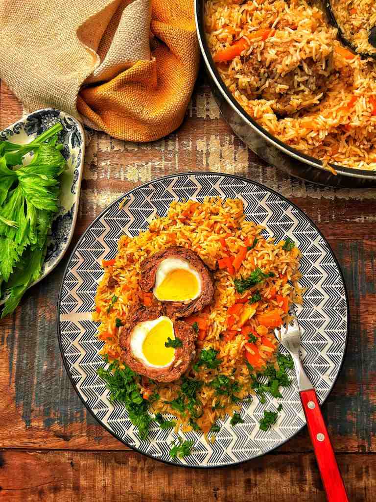 Da quando cucino da questo libro bellissimo, “Samarkand” di Caroline Eden & Eleanor Ford, mi viene sempre da pensare alla celeberrima canzone di Roberto Vecchioni, “Samarcanda”, una musica dal ritmo e dal ritornello molto orecchiabili, e che, come Vecchioni stesso l’ha definita è una favola grottesca. A me ricorda qualche testo di Calvino, dalle “Città invisibili”. Hop hop cavallo…. Insomma risentitela. Dietro quelle note facili e melodiose c’è invece qualcosa di drammatico. Invece io vi invito a preparare per le feste questo meraviglioso pilaf che affonda le sue radici a Dushanbe, capitale del Tagikistan. Le uova sode vengono avvolte in un rivestimento di carne speziata e cotte sotto il riso, profumando l’intero piatto. Forse è uno tra i piatti caucasici più buoni che abbia mai gustato.