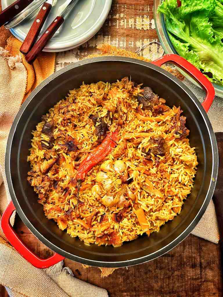 Quando voglio preparare un piatto esotico, bello, elegante, e allo stesso tempo ricco in sapori e storie, ormai faccio il “Plov”, il piatto iconico dell’Uzbekistan. Lo si mette a tavola e ognuno se ne serve, tra chiacchierate e ristate. Il plov è un pilaf di riso a base di carne (agnello o manzo), carote gialle, cipolle e spezie, cotto per assorbimento in una pentola tradizionale, chiamata “kazan”. Io non ce l’ho, ma vale lo stesso. L’aggiunta di elementi raffinati come uvetta o frutta secca lo rende degno di una festa o di un matrimonio Un “plov elegante” si distingue per la qualità degli ingredienti, l’equilibrio delle spezie, il riso sgranato, carne tenerissima e un equilibrio tra la sapidità della carne e la dolcezza delle carote e dell’uvetta. Se desiderate (o se i vostri ospiti desiderano) un plov con un gusto più piccante, aggiungete un po’ di coriandolo macinato o un’altra spezia a vostra scelta.