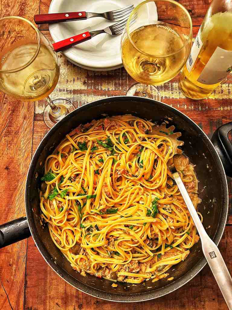 Nel frattempo, scaldare l’olio in una padella capiente, aggiungere l’aglio e rosolarlo fino a quando non diventa dorato. Versare il bicchiere di vino e lasciare bollire per un minuto o due, quindi aggiungere il tonno e mescolare per un minuto. Aggiungere la scorza di limone, il peperoncino in fiocchi, la rucola e il prezzemolo, se lo si utilizza. Infine, aggiungere i capperi e assaggiare per verificare il condimento. Aggiungere un pizzico di sale e una spruzzata di limone se necessario, o un po’ più di peperoncino per rendere il piatto più piccante. Mettere da parte.