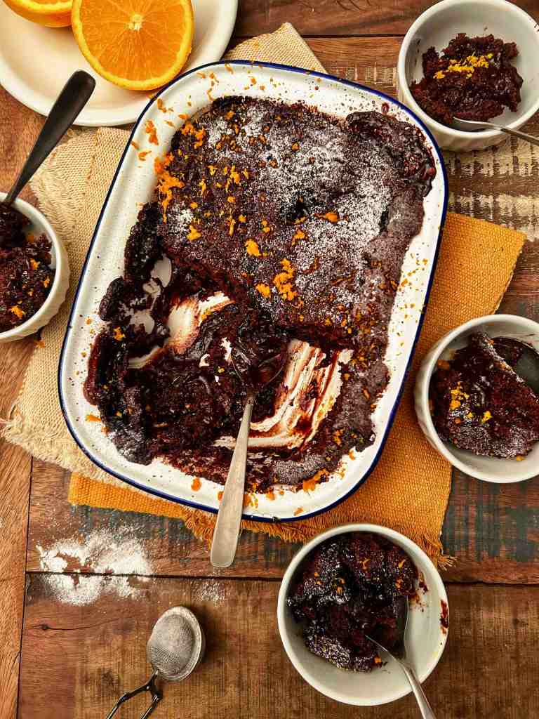 In una grande ciotola mescolate 150 g di zucchero semolato, la farina, il lievito, 30 g di cacao in polvere e il sale marino fino. Grattugiate finemente la scorza di una delle arance e poi mescolate tutti gli ingredienti secchi. Grattugiate finemente, o sbucciate e affettate finemente, la scorza di un’altra arancia e mettetela da parte. Spremete le arance in una brocca per ottenere 125 ml di succo d’arancia (in alternativa, utilizzate 125 ml di succo d’arancia fresco). Mescolate l’olio vegetale e l’estratto di vaniglia nel succo. Amalgamate il composto liquido agli ingredienti secchi. Versate l’impasto nella teglia preparata e livellate la superficie. Mettete a bollire una pentola d’acqua. In una ciotola media, unite lo zucchero di canna chiaro con i restanti 100 g di zucchero semolato e 25 g di cacao. Cospargete questo composto di cioccolato e zucchero in modo uniforme sull’impasto al cioccolato. Versate 300 ml di acqua appena bollita sulla superficie e poi mettete la teglia in forno. Cuocere per 35-40 minuti, fino a quando la superficie non si sarà solidificata, quindi togliere dal forno e lasciare riposare per 15 minuti. Setacciare lo zucchero a velo e cospargere con la scorza d’arancia messa da parte. Servire subito o con gelato senza latticini, panna o yogurt, a seconda dei gusti!
