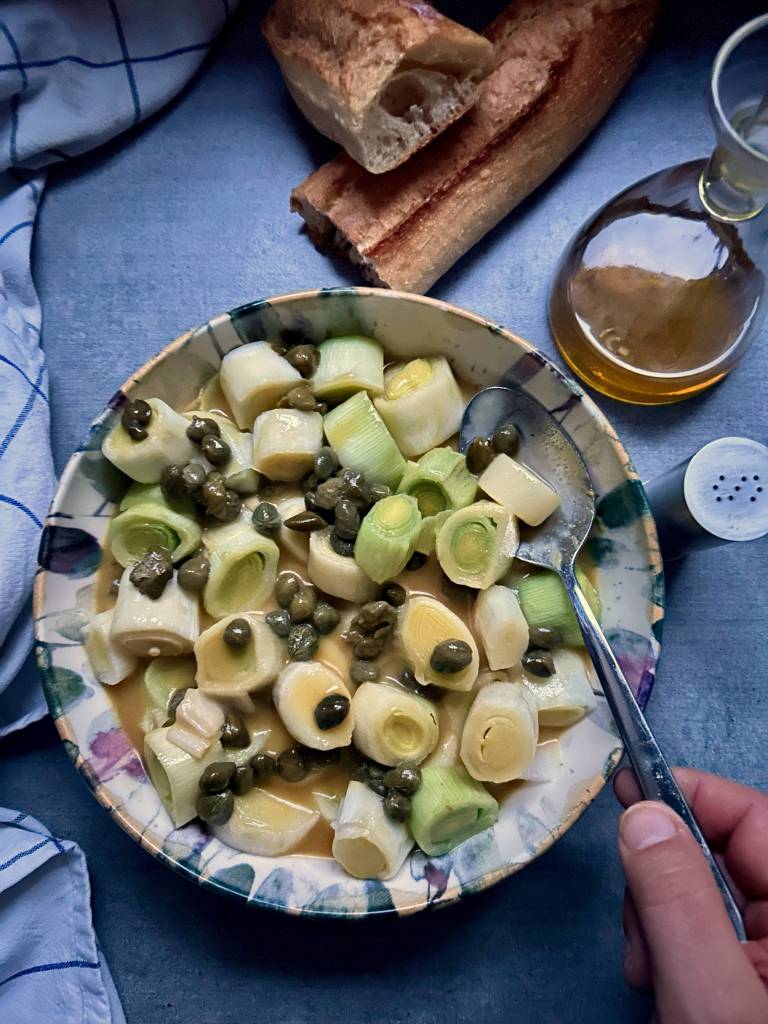 Questa ricetta in cui i porri sono cotti al vapore, e si prepara una deliziosa vinaigrette al miele, senape e capperi, è veramente semplice e assolutamente geniale. Servire i porri in questo modo li rende perfetti come contorno o come antipasto: il segreto è lasciare che la vinaigrette penetri all’interno degli strati. E vedrete che cosa meravigliosa! Si possono preparare in anticipo e lasciarli marinare. Per completare il quadro di una cenetta perfetta, sfiziosa, magari a due, vi suggerisco di aggiungere del pane croccante, uova sode, maionese e, consiglio d’amico, delle foglie di rucola, che, con la loro tipica caratterista pungente, fanno da necessario contraltare a tutto questo cibo sorprendente.